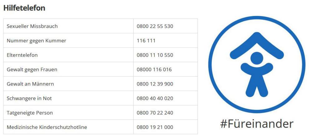 Kontakt: Tel. 08000 - 116 016 / Mail: info@hilfetelefon.de